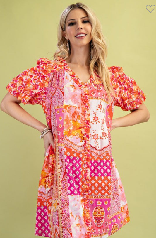 Pink Mixed Print Short Sleeve Dress