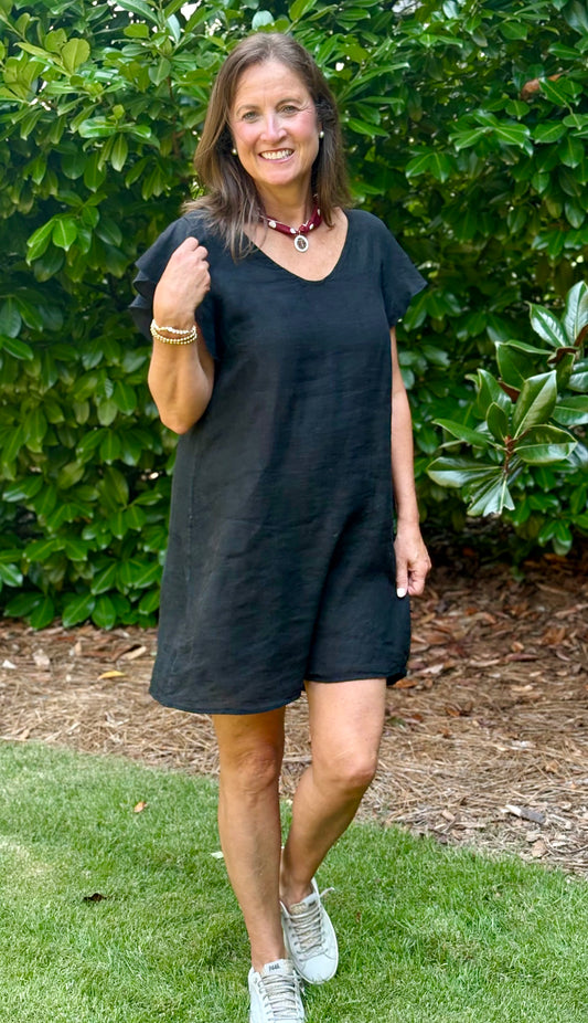 Round Neck Flutter Sleeve Shift Linen Dress- 5 colors