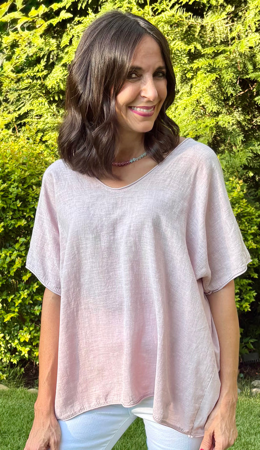 Rose Linen V Neck Short Sleeve Top