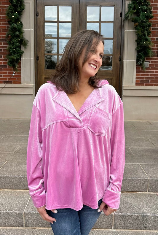 Rose Pink Velvet V Neck Tunic Top