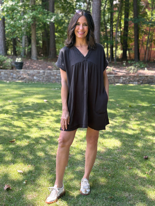 Rolled Sleeve Button V Neck Detail Linen Dress-5 colors