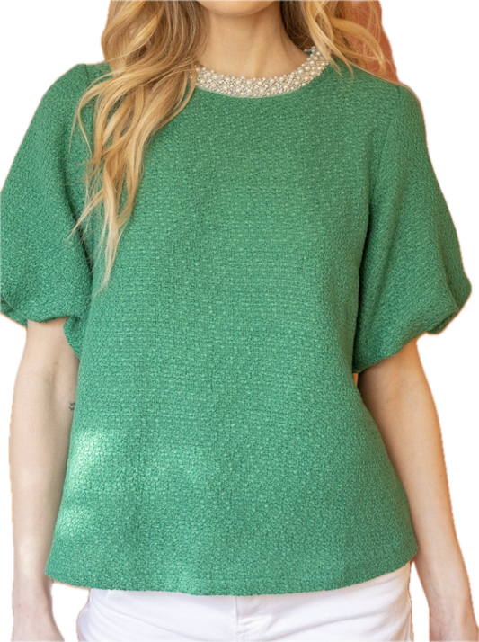 Pearled Trimmed Bubble Sleeve Tweed Top/ 2 colors