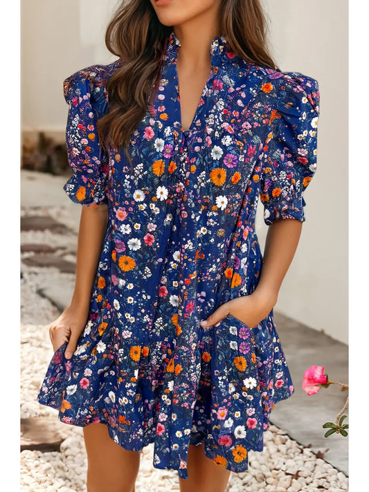 Wild Daisy Floral Split Neck Puff Sleeve Mini Dress