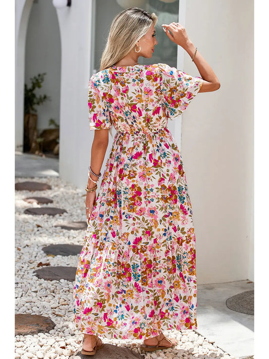 Floral Short Sleeve V Neck High Waist Maxi Dress