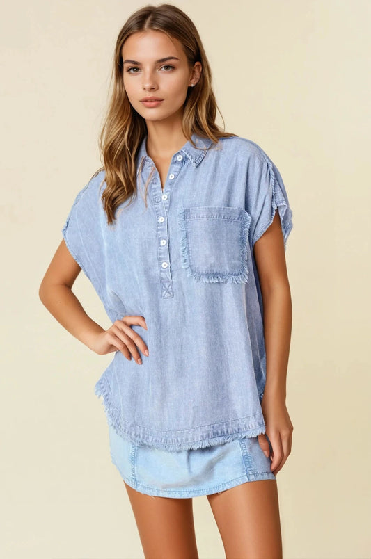 Tencel Denim Fray Detailed Dolman Short Sleeve Top