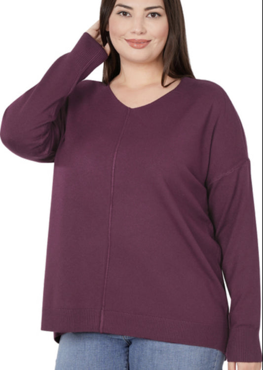 Zenana Plus Size V-neck Front Seam Sweater / 2 colors