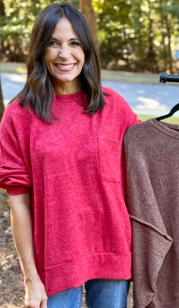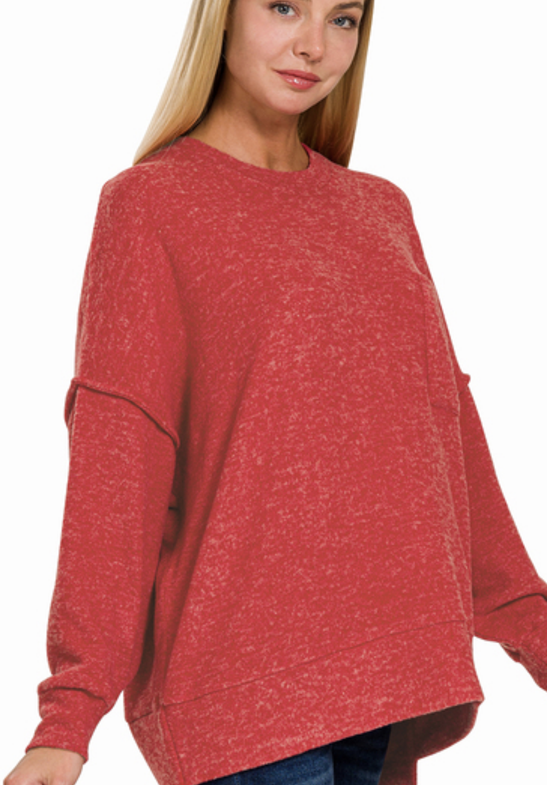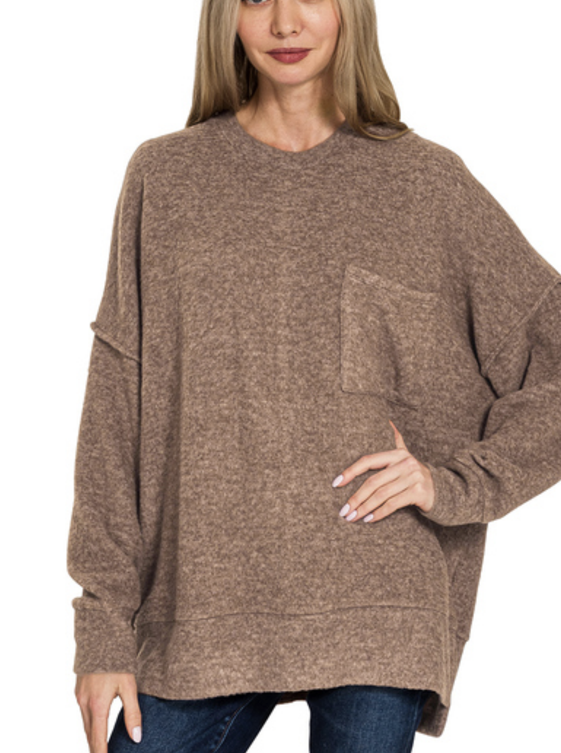 Stay cozy and chic in this oversized brushed mélange sweater, designed with the perfect balance of comfort and effortless style. The drop shoulder fit and hi-low hem give it a relaxed silhouette, while seam accents and a flat chest pocket add subtle detail. Made from soft, luxe fabric, this sweater is a must-have for layering season after season. Available in four colors.