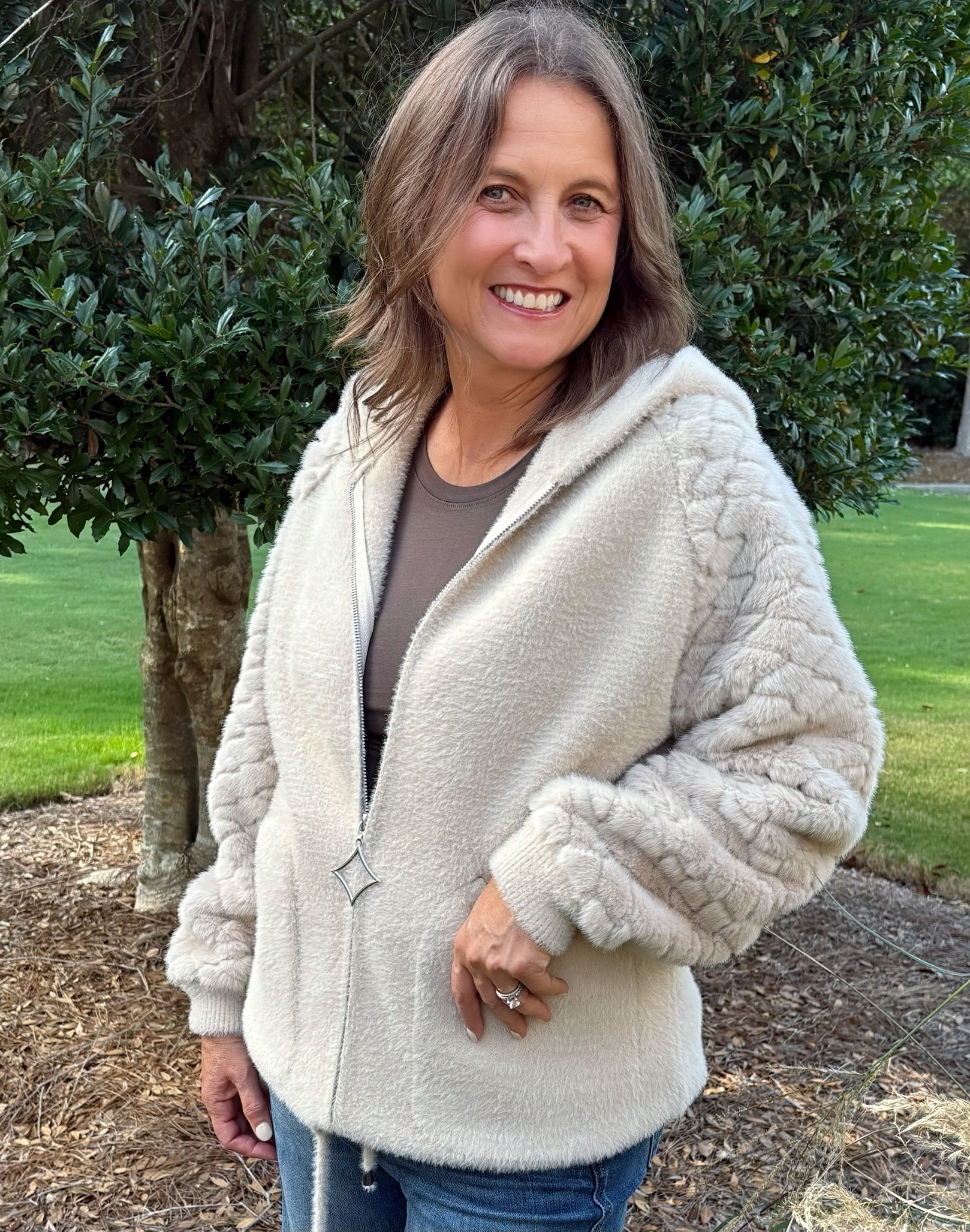 Stay cozy without sacrificing style in this fleece knit zip hoodie. Crafted from ultra-soft fabric, it features a relaxed fit with a full front zip for easy wear. The textured braided detailing along the sleeves adds a unique touch, while the roomy front pockets and adjustable drawstring hem make it as functional as it is chic. Perfect for layering over casual looks or lounging in comfort.