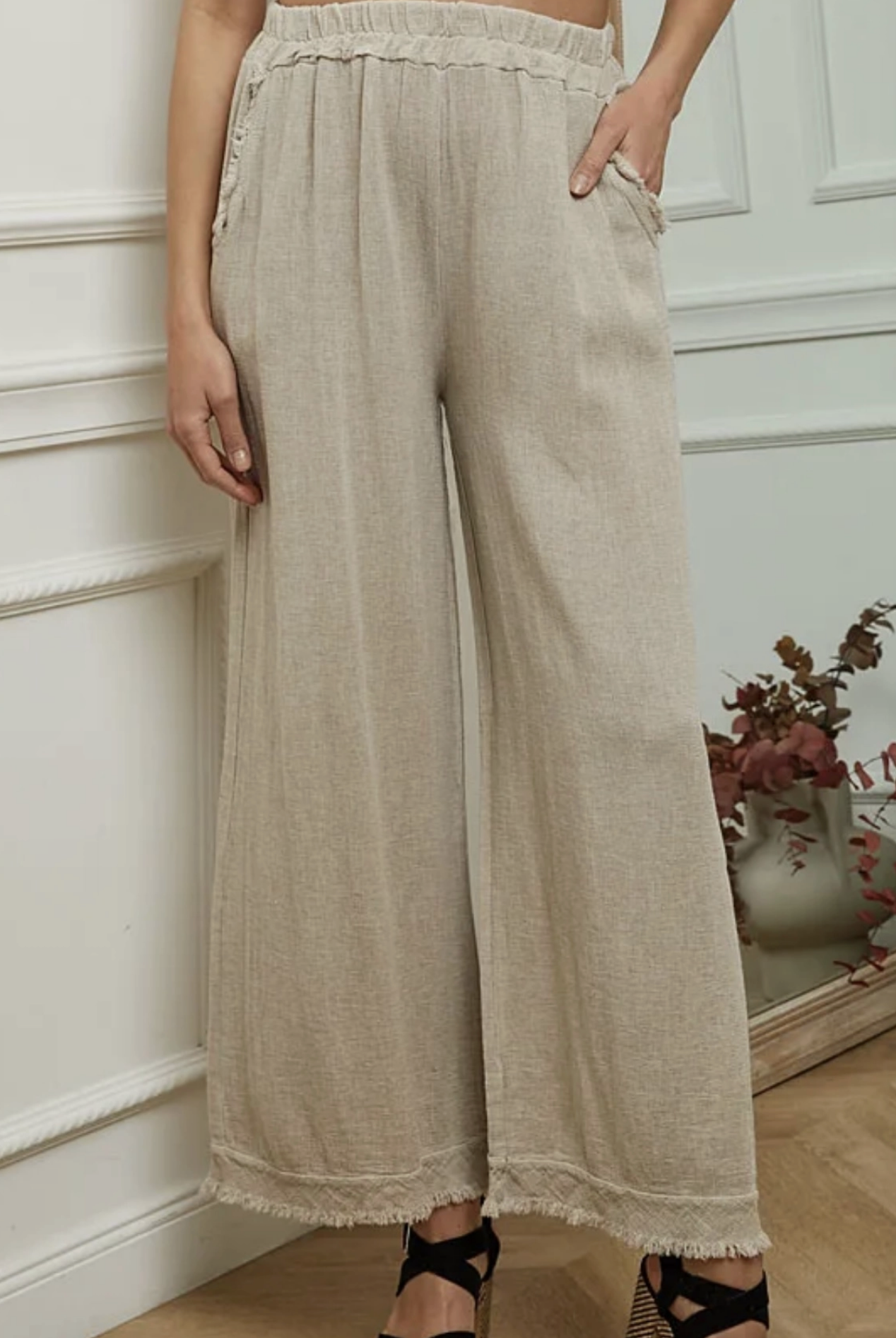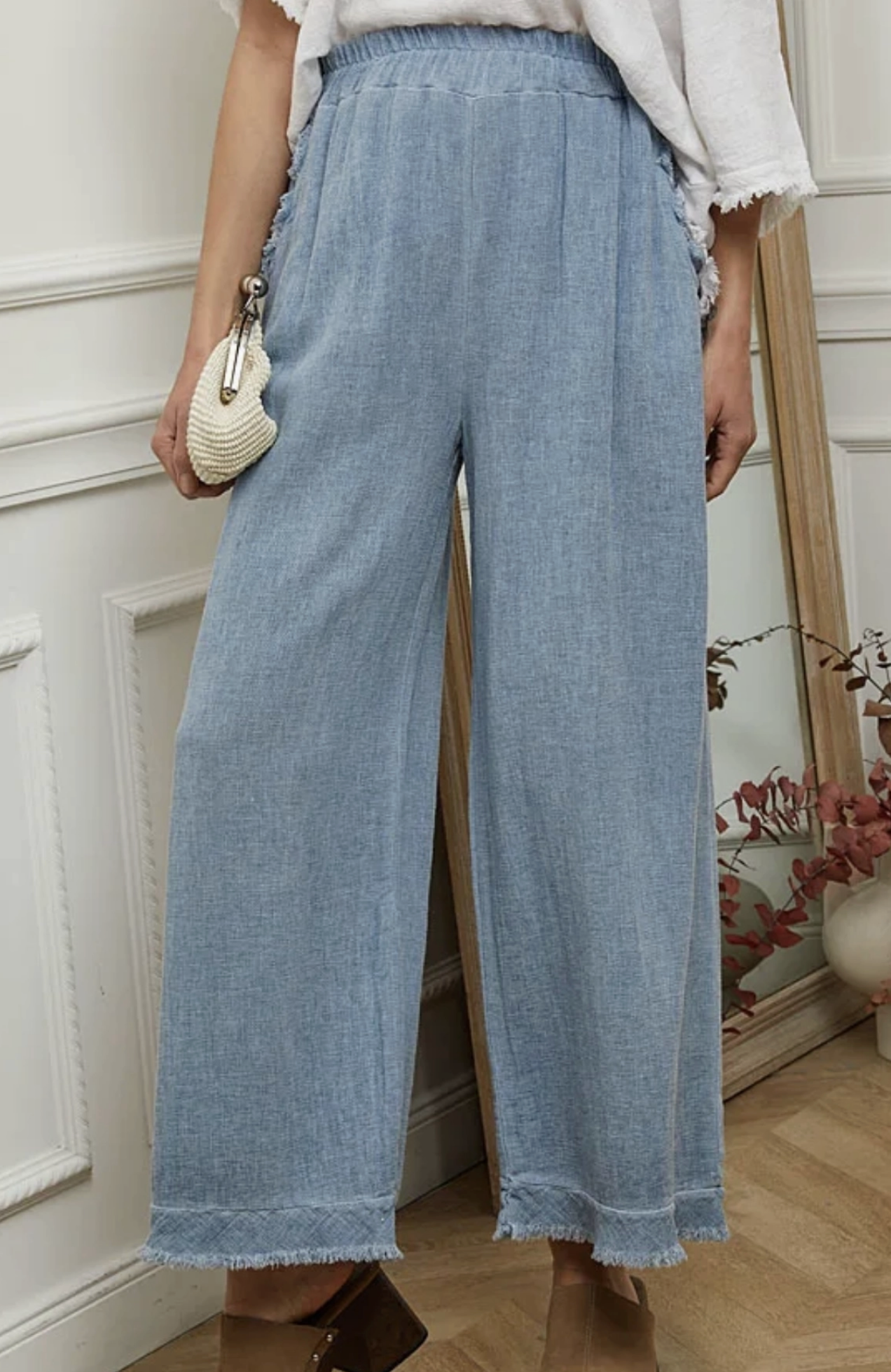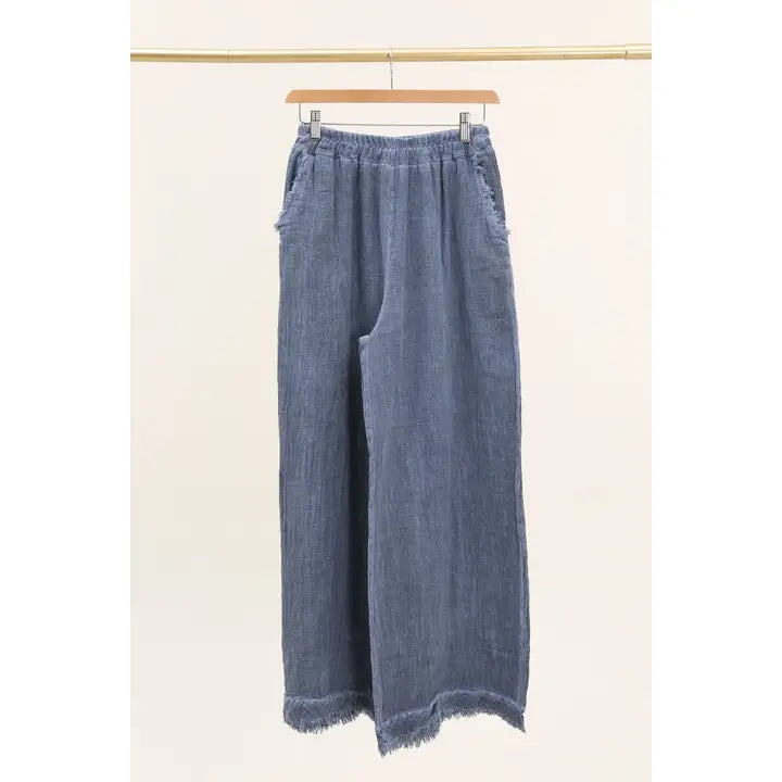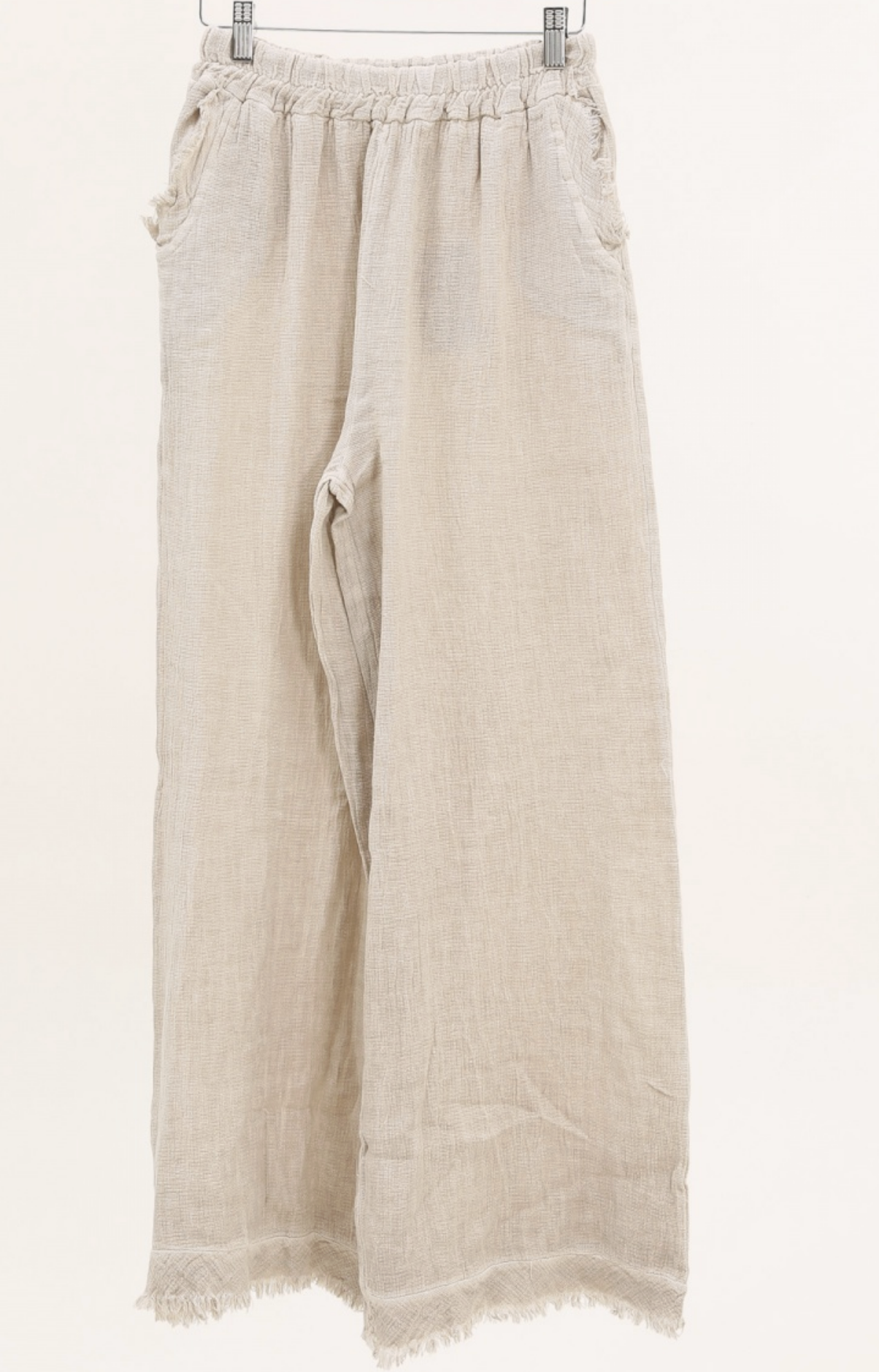 - Frayed Hem Detail Step into effortless elegance with these Italian Linen Trouser Pants. Crafted from breathable, high-quality linen, these trousers offer a relaxed yet polished fit that’s perfect for warm weather. Featuring a tailored silhouette and versatile design, they’re ideal for everything from casual outings to dressier occasions. Available in seven stunning colors, these trousers are a must-have wardrobe staple for those who value comfort without compromising style.