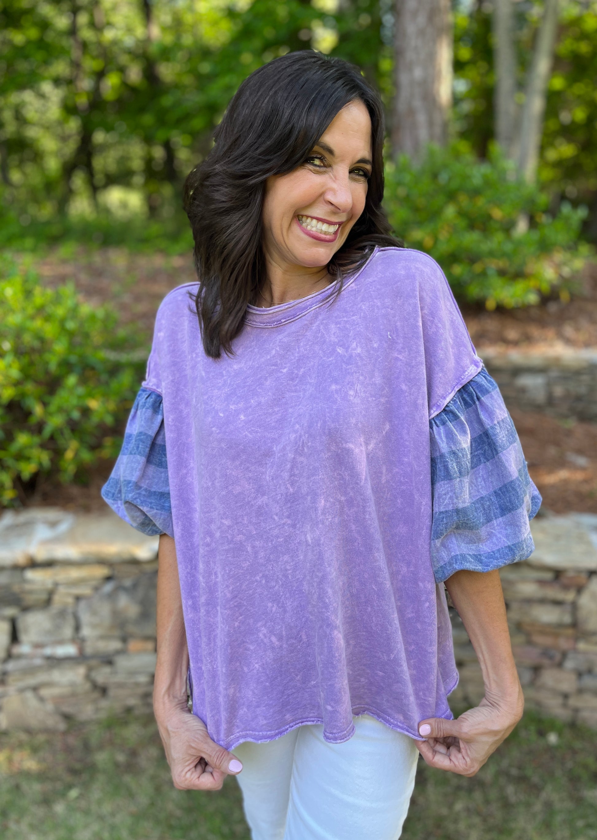 - Add some flair to your summer wardrobe with our Mineral Washed Plaid Puff Sleeve Top. The unique mineral washed fabric gives it a vintage feel, while the playful puff sleeves add a touch of fun. Perfect for any casual occasion, this top is a must-have for any fashionista!