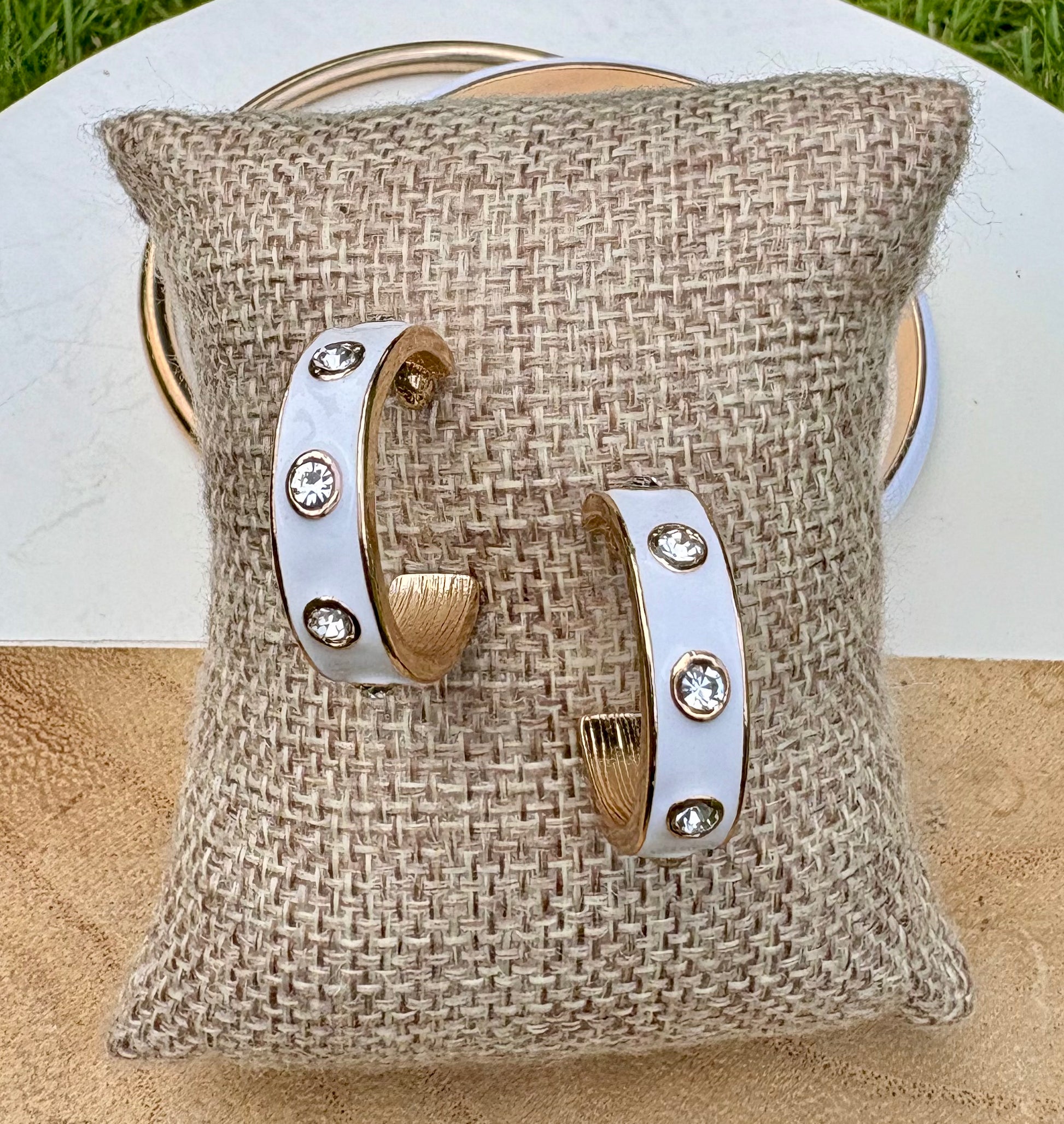 - pair with Graham white bangle The Pam White Epoxy Hoop Earrings are a chic and modern twist on a classic accessory. Featuring a sleek hoop design with a smooth, high-gloss white epoxy finish, these earrings offer a fresh and sophisticated look. Lightweight yet durable, they provide all-day comfort without compromising on style. Perfect for adding a touch of elegance to any outfit, the Pam White Epoxy Hoop Earrings are a must-have for those who love timeless accessories with a contemporary edge.