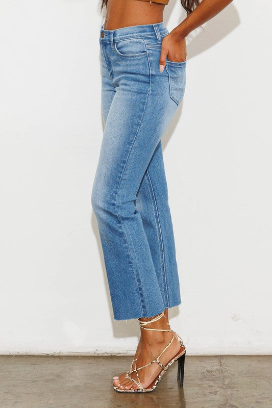 * STRETCH DENIM, MID RISE, ANKLE LENGTH FLARE JEAN,