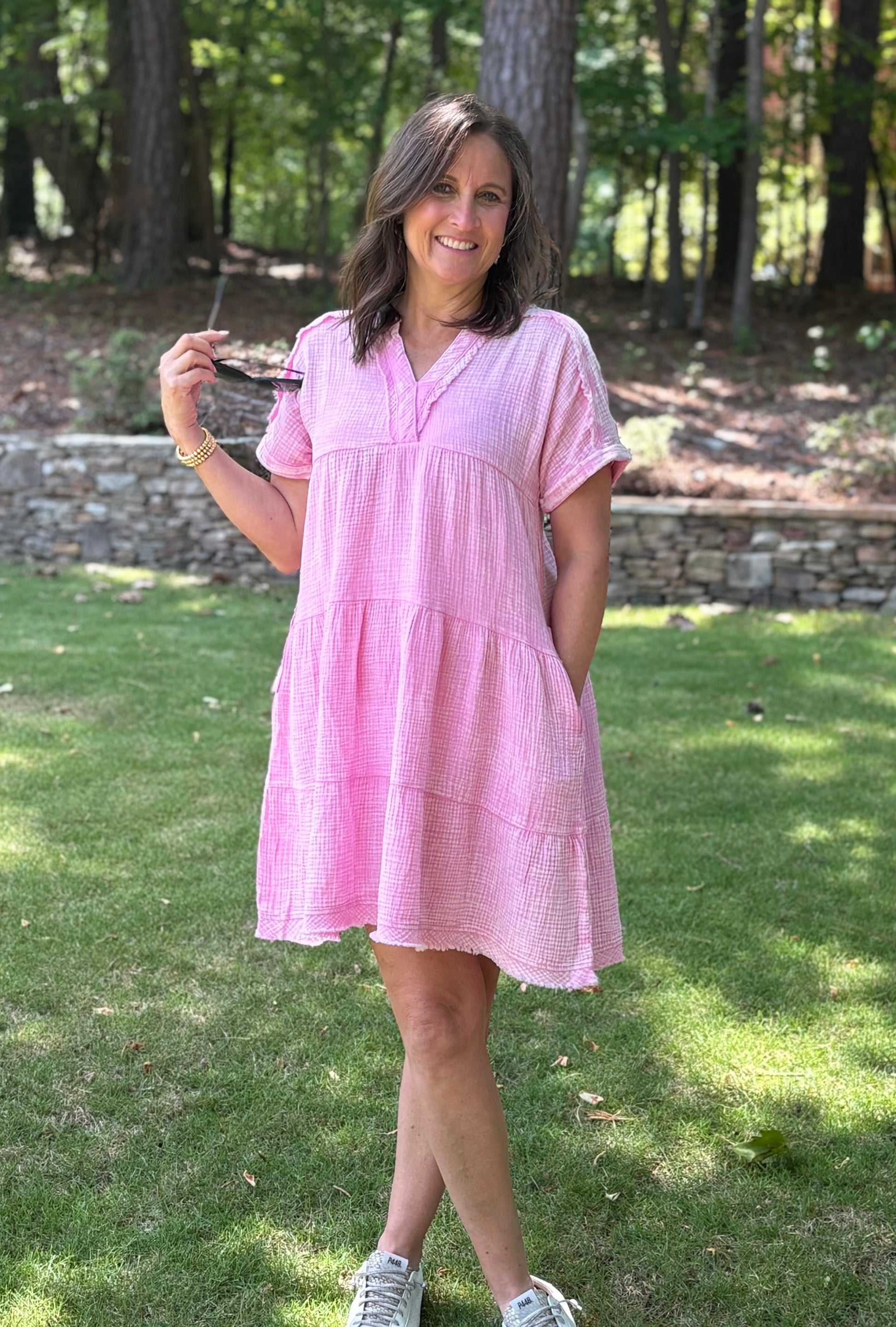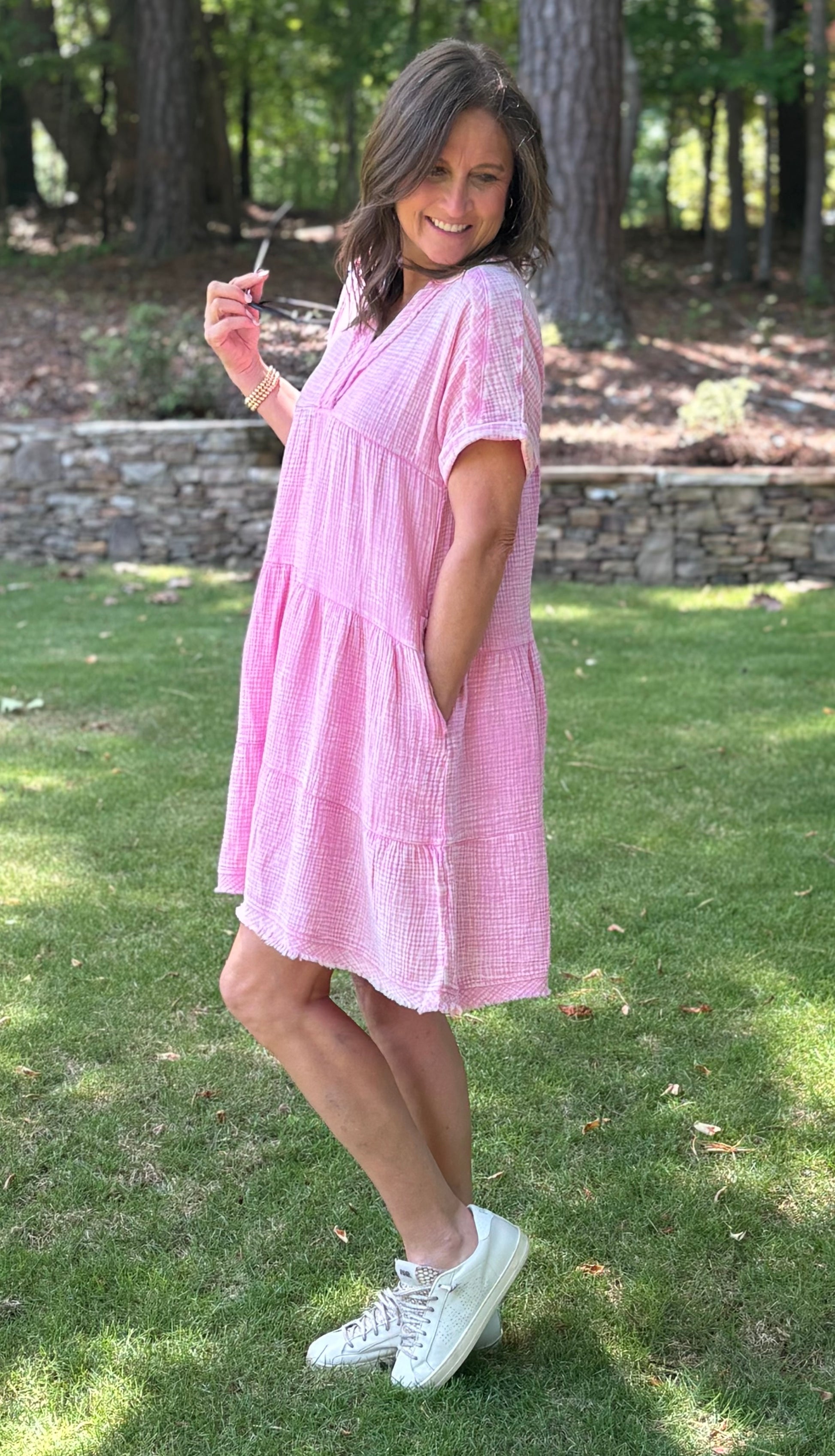 A perfect bright pink dress that is super soft, light and breezy. It has quickly become a favorite to pull on to run errands and grab lunch with a friend.