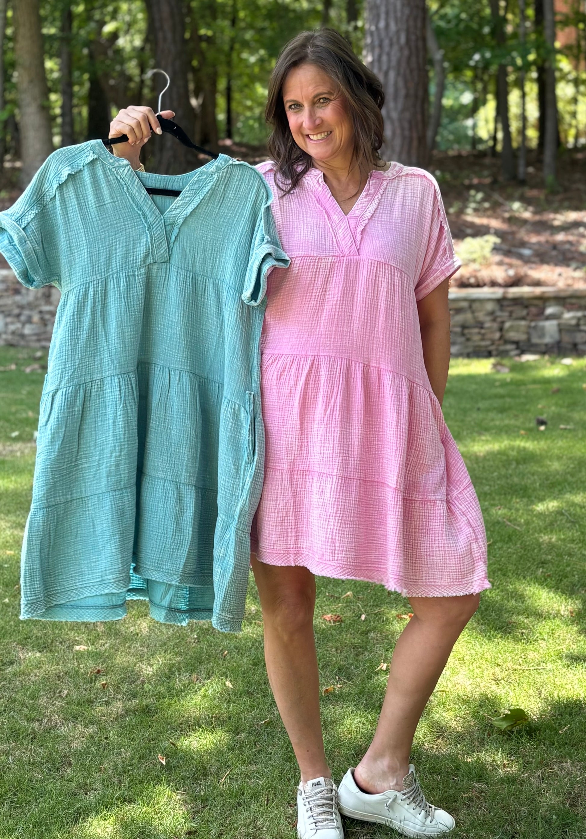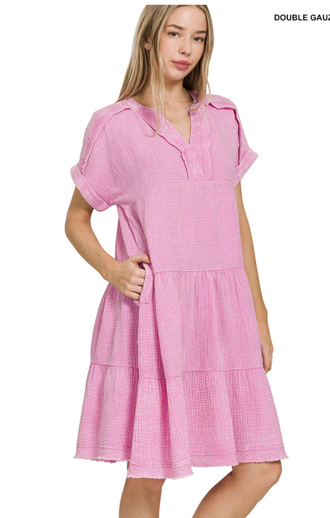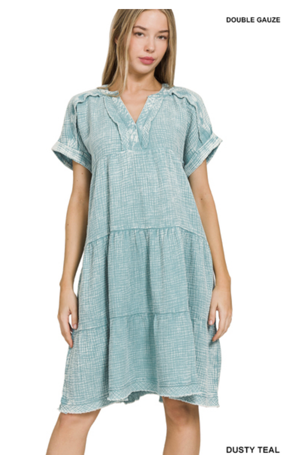 Washed Gauze Cotton V Neck Short Sleeve Dress / 2 colors